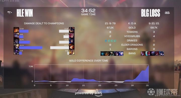 第34分钟,HLE团战1换5团灭BLG拆掉基地拿下首局,9-21。